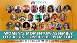 The virtual Women’s Momentum Assembly for a Just Fossil Fuel Phaseout will be held on March 31, 2026, from 1:00 PM EDT to 5:00 PM EDT and live-streamed globally. Women leaders from regions around the world will present across three panels featuring advocacy and action from the frontlines of the climate crisis, policy spheres advancing fossil fuel phaseout, and leadership designing a just and equitable global energy and economic transition. A successful outcome for the Colombia conference will require the leadership and experiences of women leaders, and the WECAN Assembly is convening to ensure that this leadership is central to the global discourse.